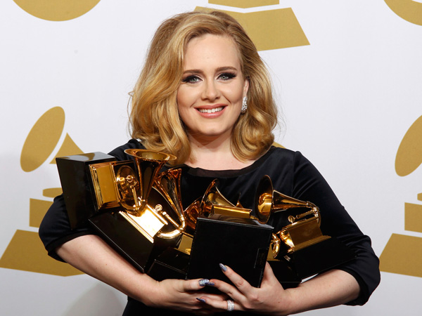 Singer Adele holds her six Grammy Awards at the 54th annual Grammy Awards in Los Angeles, California February 12, 2012. Soul singer Adele triumphed in her return to music's stage on Sunday, scooping up six Grammys and winning every category in which she was nominated including album of the year for "21" and best record with "Rolling In the Deep." (REUTERS)