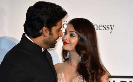 Indian actor Abhishek Bachchan (L) and his wife, actress Aishwarya Rai Bachchan pose as they arrive for the amfAR 21st Annual Cinema Against AIDS during the 67th Cannes Film Festival at Hotel du Cap-Eden-Roc in Cap d'Antibes, southern France, on May 22, 2014. (AFP)