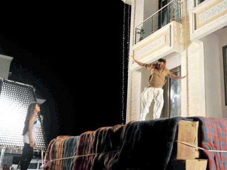 Although Kumar was provided with a cable and harness for the action scene, he preferred to show off his daredevilry by ditching the safety measures and expertly diving onto the surrounding boxes and mattresses placed below.
