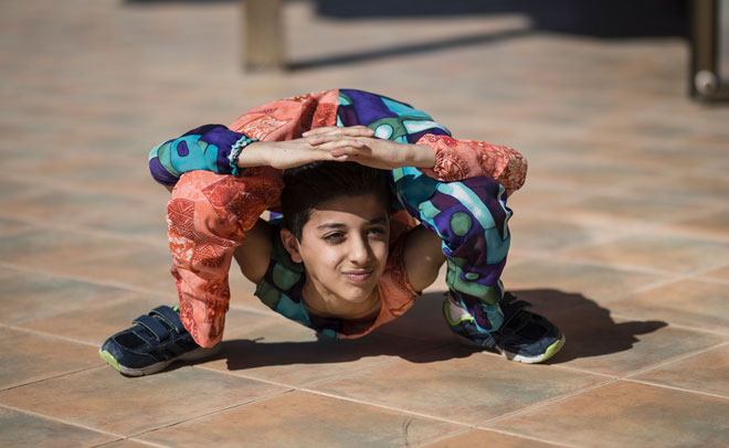 Mohammed, just 1.37 metres (four foot, six inches) tall and weighing 29 kilograms (64 pounds), can bend his body in seemingly impossible ways, throwing his feet over his shoulders with reckless abandon or jumping into a spider-like pose.