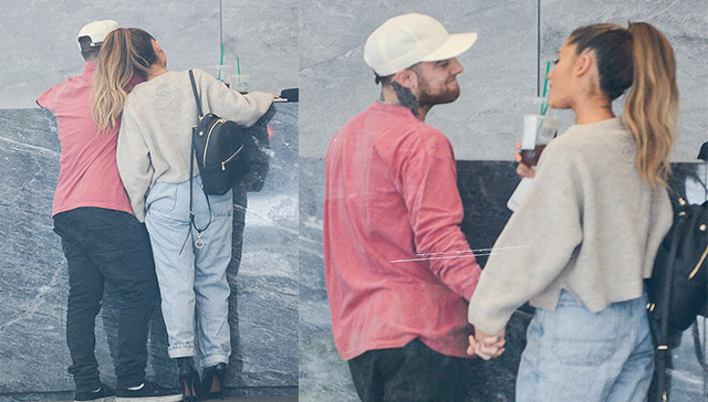 Rapper Mac Miller and Ariana Grande enter the Sirius XM Studios.