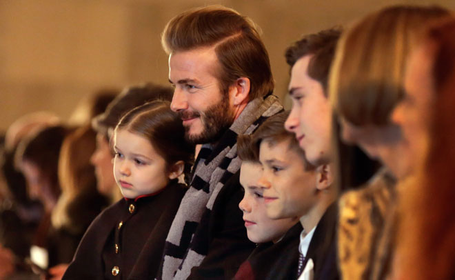 David Beckham sits in the front row at the Victoria Beckham Fall/Winter 2016 collection presentation with his children Harper, Cruz, Romeo and Brooklyn at New York Fashion Week February 14, 2016. (Reuters)