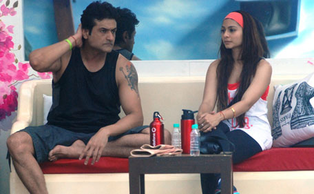 Reality show Bigg Boss 7 contestant Arman Kohli and Tanisha having a conversation. (SUPPLIED)