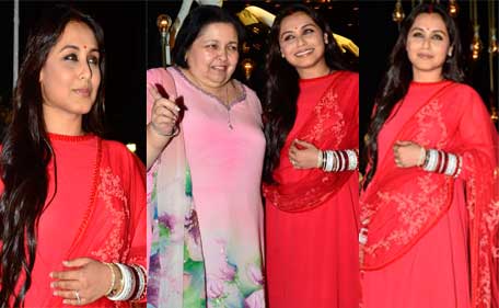 Bollywood actress Rani Mukerji, who tied the knot last month to filmmaker Aditya Chopra, glowed in red as she attended the Diva'ni store launch in Mumbai along with her mother-in-law Pamela Chopra.