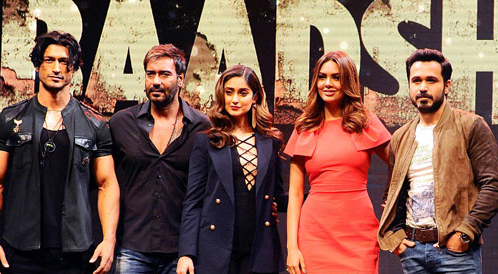 Vidyut Jamwal (L), Ajay Devgn (2L), Ileana D'Cruz (C), Esha Gupta (2R) and Emraan Hashmi pose for a photograph during a promotional event for the forthcoming Hindi film 'Baadshaho' directed by Milan Luthria in Mumbai on August 7, 2017 (AFP).