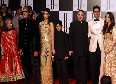 Bollywood star Amitabh Bachchan with wife Jaya Bachchan, daughter Shweta Nanda, son-in-law Nikhil Nanda, son Abhishek Bachchan, daughter-in-law Aishwarya Rai-Bachchan on the eve of his 70th birthday party in Mumbai. (AFP)