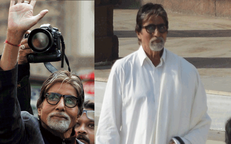 Indian Bollywood film actor Amitabh Bachchan (L) acts at the ancient Jama Masjid in Ahmedabad on Janaury 27, 2014. Bachchan came to shoot for Gujarat Tourism's promotional film ' Khushboo Gujarat Ki'. AFP