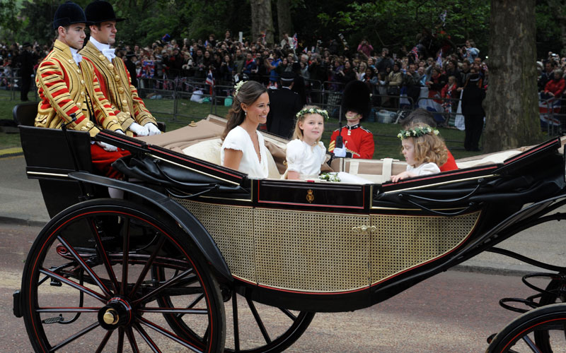 Pippa Middleton makes the journey with bridesmaids along the Processional Route to Buckingham Palace after the wedding of her sister Kate to Britain's Prince William in London on April 29, 2011 (AFP PHOTO)