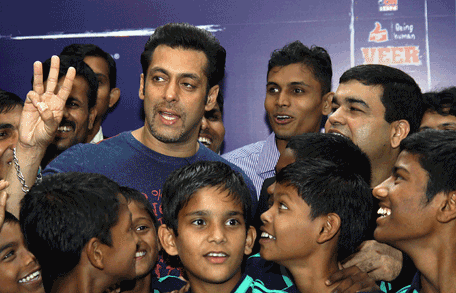 Indian Bollywood actor Salman Khan greets children during the launch of a campaign for his 'Being Human' foundation in Mumbai. (AFP)