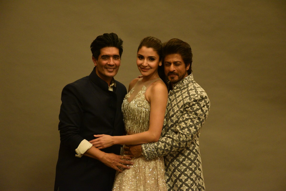 Fashion designer Manish Malhotra (L), and Indian Bollywood actors Anushka Sharma (M) and Shah Rukh Khan showcase creations by designer Manish Malhotra at the fundraiser Mijwan 2017 fashion show in Mumbai.
