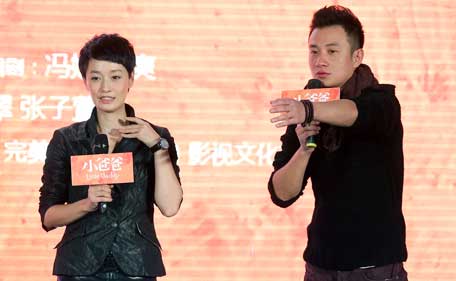 (FILE) Dec. 5, 2012 photo, actor Wen Zhang, right, and his wife Ma Yili, a producer and actress attend a presser for their TV series "Little Daddy" held in Beijing, China. (AP)