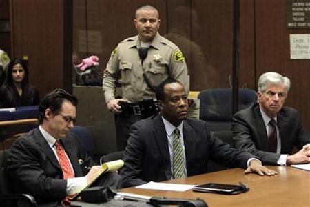 Doctor Conrad Murray (C), the late Michael Jackson's personal physician, sits with his lawyers Edward Chernoff (L) and Michael Flanagan during his arraignment on a charge of involuntary manslaughter in the pop star's death, in Los Angeles, January 25, 2011 (REUTERS)