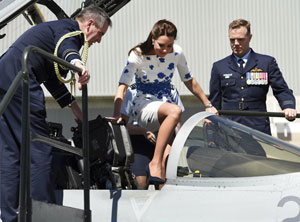 Catherine, the Duchess of Cambridge (C), climbs into the cockpit of a RAAF Super Hornet of 1 Squadron assisted by Chief of Air Force, Air Marshall Geoff Brown (R) and Commanding Officer of Number 1 Squadron, Wing Commander Stephen Chappell (R), at RAAF Base Amberley, near Brisbane, April 19, 2014. Britain's Prince William and his wife Catherine are undertaking a 19-day official visit to New Zealand and Australia with their son George. (Reuters)