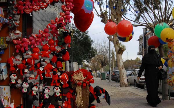 A veiled Syrian woman, right, walks past Valentine decorations displayed at a gift shop in Damascus, on Tuesday February 8 (AP)