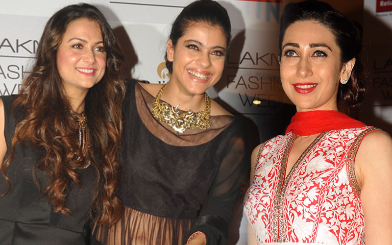 Indian Bollywood actresses Amrita Arora (L) and Kajol Devgan attend the Lakme Fashion Week (LFW) Winter/Festival 2013 in Mumbai on August 22, 2013. (AFP)