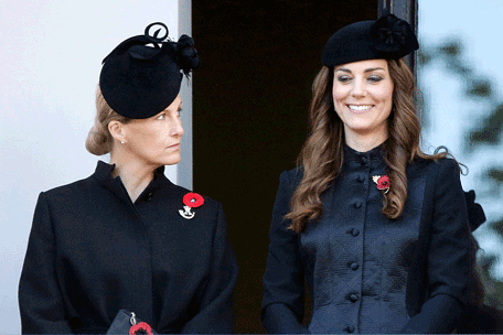 Catherine, Duchess of Cambridge smiles from a balcony, accompanied by Sophie, Countess of Wessex (L) as they watch a wreath laying ceremony at the Cenotaph on Whitehall on November 10, 2013 in London, United Kingdom. People across the UK gathered to pay tribute to service personnel who have died in the two World Wars and subsequent conflicts, as part of the annual Remembrance Sunday ceremonies. (Getty Images)