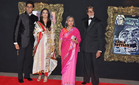 Bollywood's Bachchans at the Jab Tak Hai Jaan red carpet: (L to R) Abhishek Bachchan, Aishwarya Rai, Jaya Bachchan and Amitabh Bachchan. (Sanskriti Media & Entertainment)