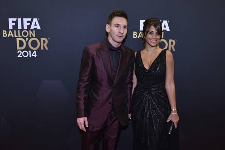 Barcelona and Argentina forward Lionel Messi (R) and his wife Argentinian model Antonella Roccuzzo pose as they arrive during the red carpet ceremony ahead of the 2014 FIFA Ballon d'Or award ceremony at the Kongresshaus in Zurich. (AFP)
