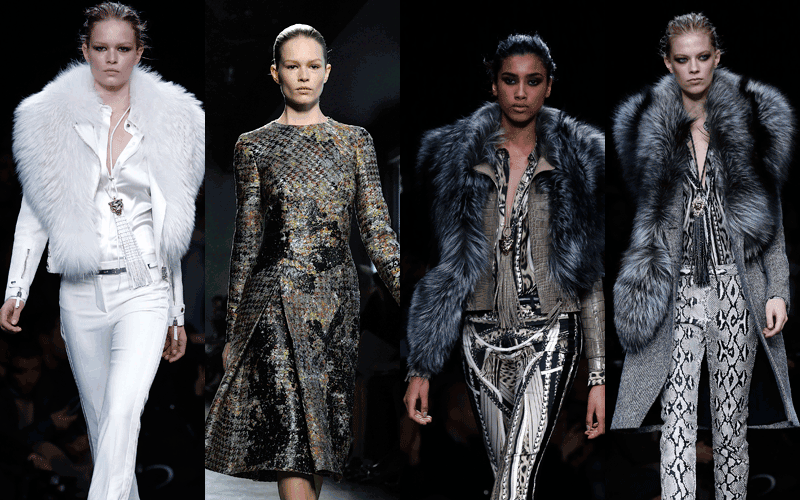 Models wear creations for Roberto Cavalli women's Fall-Winter 2014-15 collection, part of the Milan Fashion Week, unveiled in Milan, Italy, Saturday, Feb. 22, 2014. (AP)