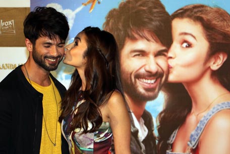 Indian Bollywood actors Shahid Kapoor (L) and Alia Bhatt pose for a photograph during a promotional event for the forthcoming Hindi film 'Shaandaar' directed by Vikas Bahl in Mumbai on August 11, 2015. AFP