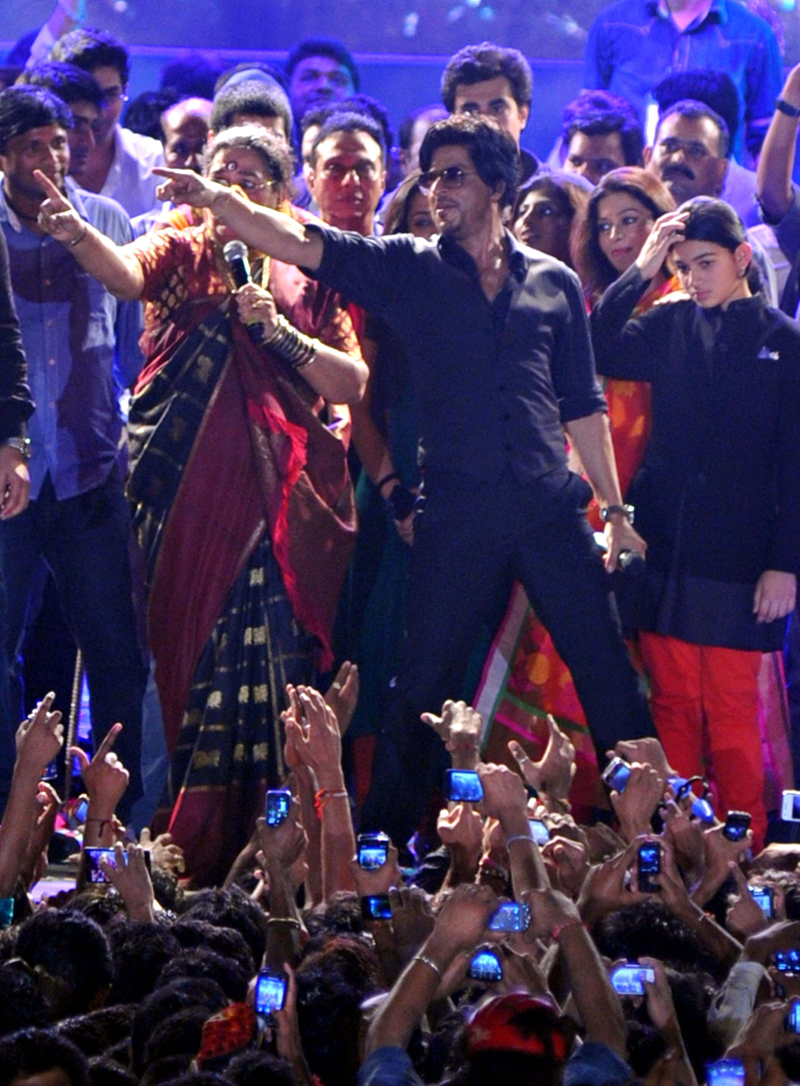Indian Bollywood actor Shah Rukh Khan gestures to the audience while attending festivities for Janmashtami in Mumbai on August 29, 2013. AFP