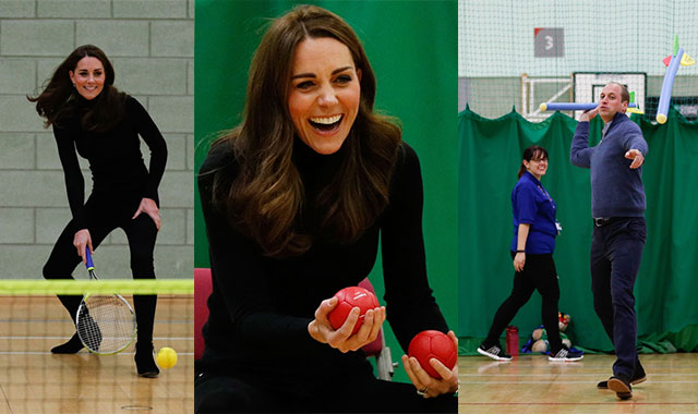 Kate, Duchess of Cambridge, plays tennis as she joins a session with a group during a visit the Coach Core Essex.