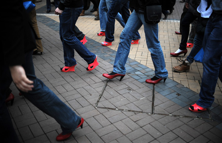 Bulgarian men wearing high heels walk during the second edition of Bulgaria's "Walk a Mile in Her Shoes", in Sofia, on March 8, 2014, as part of an international awareness campaign designed to raise awareness and stop rape, sexual assault and gender violence. AFP