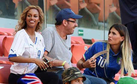 Fanny Neguesha (L), fiancee of Mario Balotelli of Italy, and Carolina Marcialis (R), wife of Antonio Cassano of Italy, look on from the stands during the 2014 FIFA World Cup Brazil Group D match between England and Italy at Arena Amazonia on June 14, 2014 in Manaus, Brazil. (Getty Images)