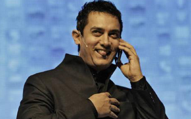 Aamir Khan as he jokingly speaks on a mobile phone during a promotional event of a mobile company in New Delhi. (REUTERS)