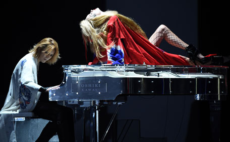 The dyed-blonde co-founder of the band X Japan -- who opened the show with a piano recital from Swan Lake -- used leopard-print fabric and gold netting in his designs and told AFP he wanted to see women wear his kimono to concerts.