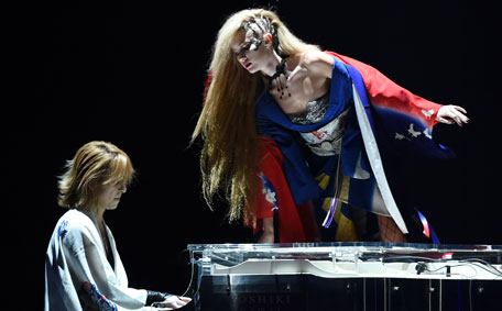 In his debut showing Saturday night at fashion week, heavy-metal rocker Yoshiki collaborated with a Kyoto-based brand on body-hugging kimono, slashed to miniskirt-length and worn with stilettos, leather collars and high-heeled boots.