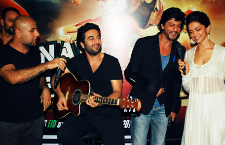 (L-R) Vishal Dadlani, Shekhar Ravjian, Shah Rukh Khan, and Deepika Padukone perform during a preview for the forthcoming Hindi film Chennai Express. (AFP)