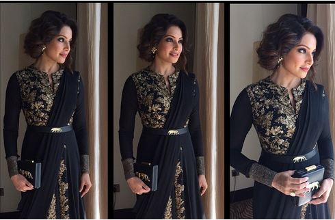 bipashabasu wrote” “In Dubai for an event ! Wearing a beautiful @sabyasachimukherjee outfit ❤️”