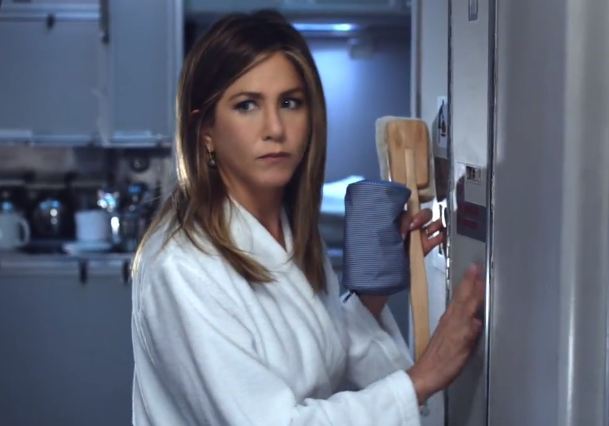 The ad opens with Aniston looking frantically for the onboard shower and lounge but being mocked and ridiculed by the cabin crew.
