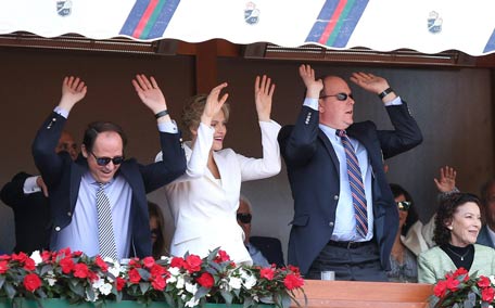Prince Albert II of Monaco and his wife Princess Charlene cheer during the Monte-Carlo ATP Masters Series Tournament final tennis match in Monaco. (AFP)