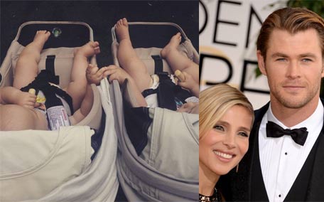 Elsa Pataky shared an adorable snap of twins 10-month-old Tristan and Sasha holding hands on her. (Instagram)