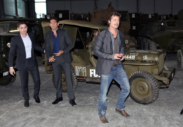 Logan Lerman, Jon Bernthal and Brad Pitt attend a photocall for 'Fury' at The Tank Museum. Pic: Getty Images