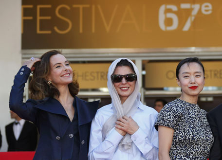 (L-R) Jury members actresses Carole Bouquet, Leila Hatami and Jeon Do-yeon pose on the red carpet as they arrive for the screening of the film "Le meraviglie" (The Wonders) in competition at the 67th Cannes Film Festival in CanneS.(REUTERS)