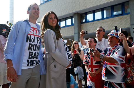 Royal supporters, right, look on as a couple impersonate Britain's Prince William and Kate, the Duchess of Cambridge as they pose for photographers, during a publicity stunt for a daily newspaper, outside St. Mary's Hospital in London, Friday, July 19, 2013. The media are preparing for royal-mania as Britain's Duchess of Cambridge plans to give birth to the new third-in-line to the throne in mid-July, at the Lindo Wing. Cameras from all over the world are set to be jostling outside for an exclusive first glimpse of Britain's Prince William and the Duchess of Cambridge's first child. (AP)