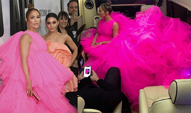 Jennifer Lopez stunned at the premiere of her new film, 'Second Act', on Wednesday night in New York City in a giant pink Giambattista Valli couture dress.