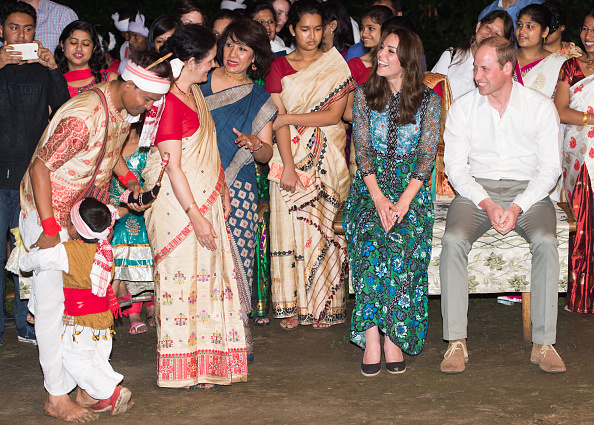 Prince William, Duke of Cambridge and Catherine, Duchess of Cambridge watch a boy dance during a Bihu Festival Celebration at Diphlu River Lodge atKaziranga National Park. (Getty Images)