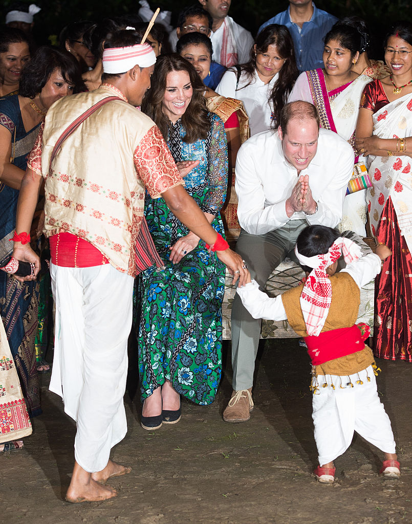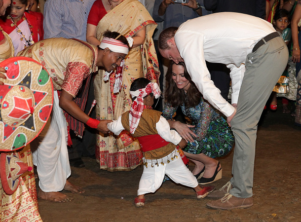 A boy steps on Prince Williams toes as Catherine, Duchess of Cambridge and Prince William, Duke of Cambridge meet dancers during a Bihu Festival Celebration at Diphlu River Lodge. (Getty Images)