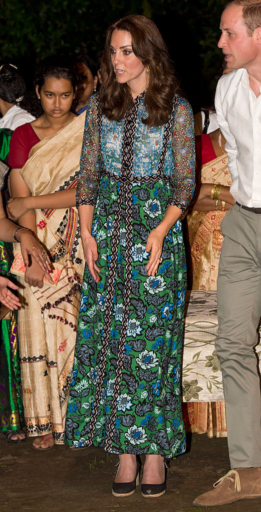 Kate wore flat cream pumps underneath a long burgundy ethnic style dress with a belt tied around the middle. (Getty Images)