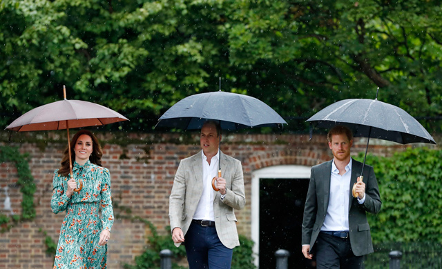 Britain's Prince William, Duke of Cambridge (C), his wife Britain's Catherine, Duchess of Cambridge (L) and his brother Britain's Prince Harry, shelter from the rain beneath umbrellas as they arrive to attend an event at the memorial gardens in Kensington Palace, west London.