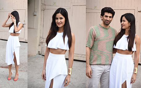 While Aditya looks suave and polished, Katrina is dressed in a white crop top, white slit flare skirt, flaunting those toned, killer abs.