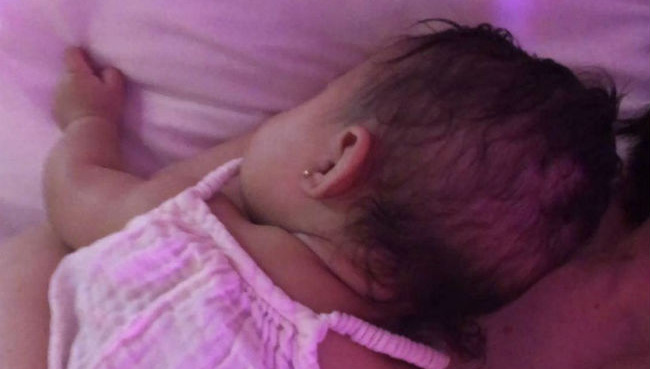Taking to the social networking site, Kylie uploaded a photograph of the tiny tot asleep on her chest as a gold piercing stud protruded from her ear lobe as she faced the camera away from Stormi's face.
