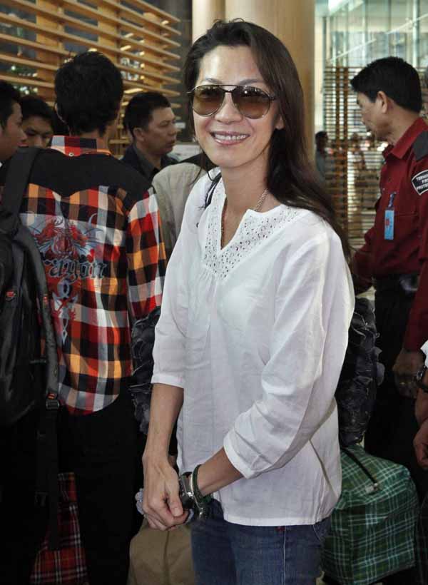 Malaysian-born actress Michelle Yeoh poses as she departs from Yangon International Airport, Yangon, Myanmar. Yeoh spent a day with Aung San Suu Kyi as part of research for her upcoming film about the democracy icon, said Win Htein, chief security of Aung San Suu Kyi (EPA)