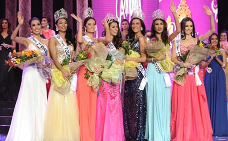 The winners of Binibining Pilipinas: (L-R) 2nd runner-up Hannah Sison, Bb Pilipinas Tourism Parul Shah, Bb Pilipinas Intercontinental Kris Janson, Bb Pilipinas Universe Mary Jean Lastimosa, Bb Pilipinas International Mary Anne Guidotti, Bb Pilipinas Supranational Yvethe Santiago, and 1st runner-up Laura Lehmann.