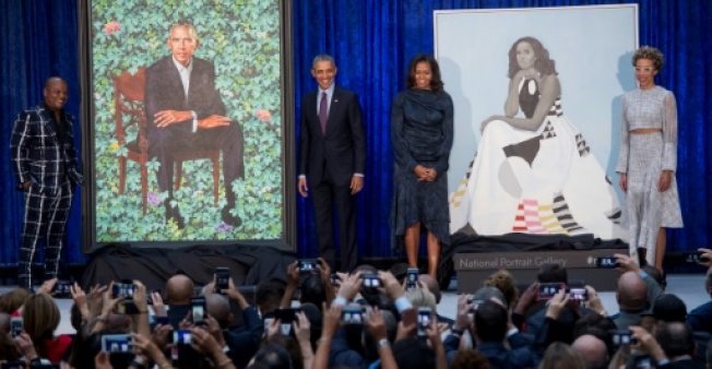 The paintings by Kehinde Wiley and Amy Sherald, commissioned by the National Portrait Gallery in Washington, were revealed at a star-studded event that is a rite of passage for most former American presidents.