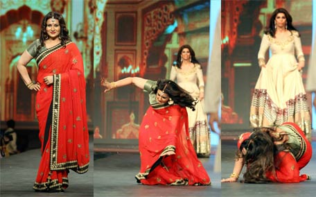 Poonam Dhillon falls as she models clothing during a cancer fundraiser in Mumbai. (AFP)